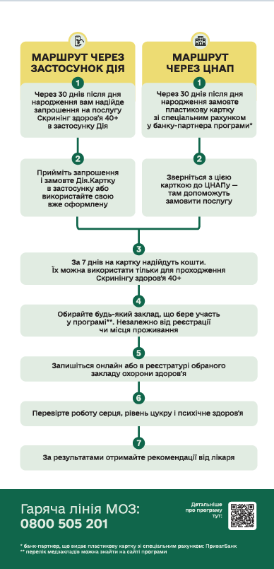 ❗️Від початку року запустили Національну програму Скринінг здоров’я 40+: орієнтована вона на людей від 40 років і старше та передбачає раннє виявлення серцево-судинних захворювань, цукрового діабету і проблем психічного здоровʼя. Таку програму ініціювали в Україні вперше — розробивши її за зразками найкращих європейських практик.Чому це потрібно ❓ Щодня в Україні понад тисяча людей помирає від серцево-судинних захворювань — вони спричиняють 60% передчасних смертей. Понад 1,2 мільйона українців та українок живуть із цукровим діабетом, а близько половини людей навіть не здогадуються, що в них є цей діагноз. Після 40 років ризики розвитку серцево-судинних захворювань та цукрового діабету зростають надто стрімко. Крім цього, до 10 мільйонів українців та українок можуть стикнутися із ментальними проблемами. Як пройти Скринінг здоров’я 40+❓ Кожна людина віком від 40 років і старше отримає запрошення на скринінг у застосунку Дія — на 30-й день після свого дня народження. Це стосується всіх українців і українок від 40 років і старше. Після прийняття запрошення необхідно замовити Дія.Картку в застосунку або ж використати свою, уже оформлену. За 7 днів на неї надійдуть кошти — 2000 гривень. Їх можна використати тільки для проходження Скринінгу здоров’я 40+. Що робити, якщо ви хочете пройти Скринінг здоров’я 40+, але не користуєтесь Дією? 🤔 Тоді для вас алгоритм участі в скринінгу здоров’я 40+ дещо інший. Достатньо через 30 днів після дня народження замовити пластикову карту зі спеціальним рахунком у банках-партнерах (наразі – ПриватБанк) та звернутися до найближчого ЦНАПу. Там вам допоможуть подати заявку, підтвердити особу та вказати спецрахунок у банку. На нього протягом 7 днів буде зараховано 2000 гривень для оплати скринінгу. Далі все працюватиме так само, як і для користувачів Дії: обираєте медзаклад із затвердженого переліку і проходите комплексне обстеження.🏥До програми Скринінг здоров’я 40+ за лічені дні вже виявили бажання доєднатися близько чотирьох сотень закладів охорони здоров’я по всій країні — комунальні, державні, приватні. Долучаються до участі у проведенні скринінгів також і лікарі-ФОПи. Про те, що входить до Національної програми Скринінг здоров’я 40+, яка відмінність програми від можливості пройти огляд у сімейного лікаря — читайте за посиланням: