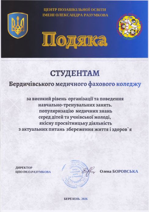 Щиро дякуємо студентам та викладачам Бердичівського медичного фахового коледжу за насиченне, високопрофесійне заняття з основ медичної допомоги, грунтовно підготовку, та особливий підхід до дітей .